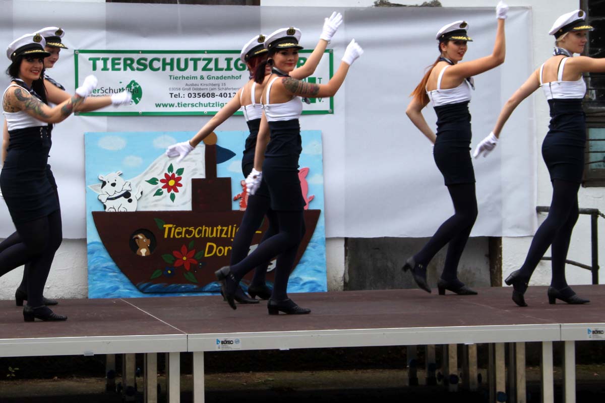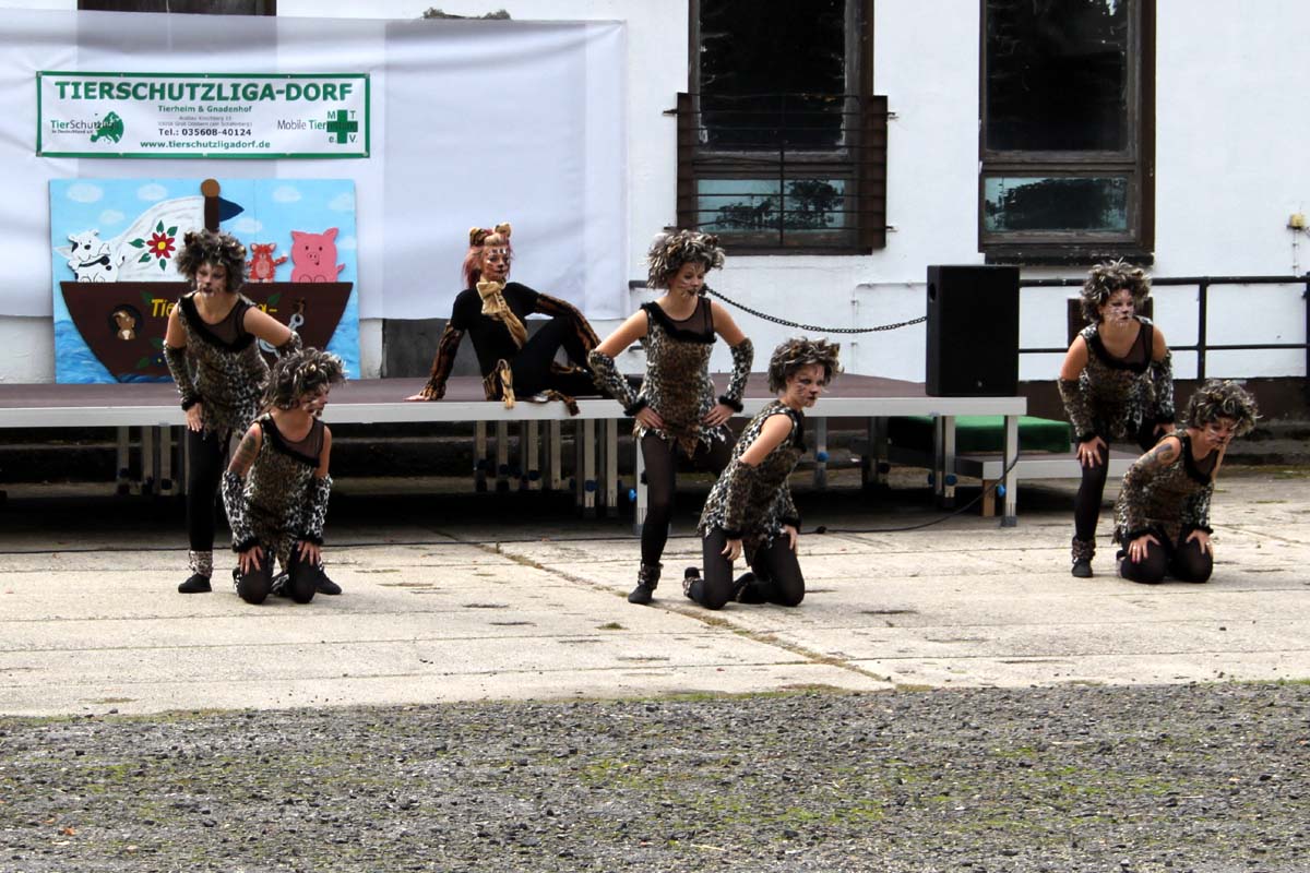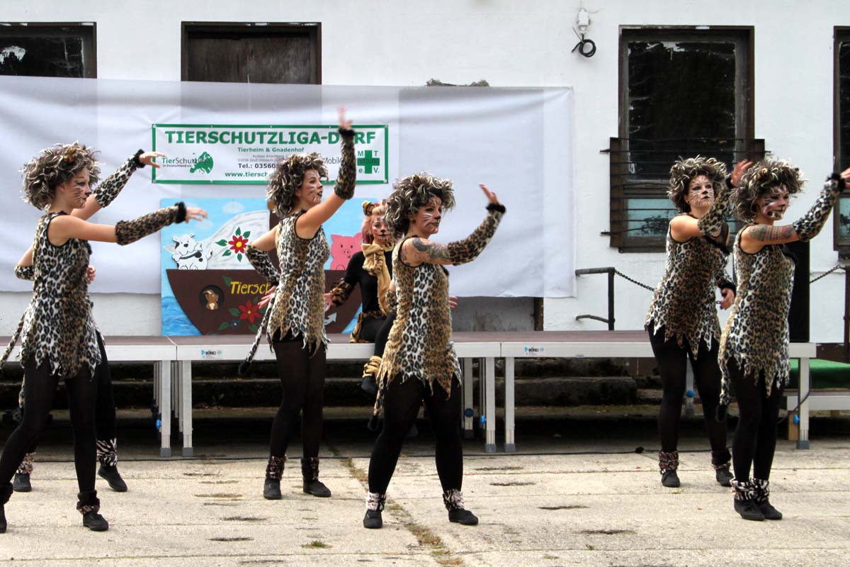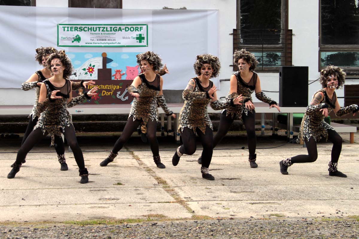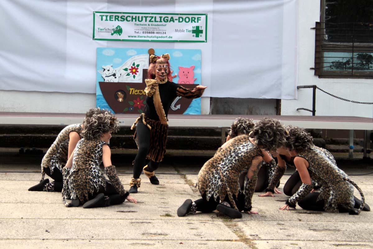 Diesmal hatte unsere Mitarbeiterin Steffi sich für das Programm etwas ganz besonderes einfallen lassen. Neben den obligatorischen Vorführungen der Tierheimhunde waren die „Hot Soles“ aus Lübbenau, eine Line-Dance Gruppe, und die Funkengarde aus Annahütte, eine Akrobatikvorführung, sowie eine Vorführung des Hundesportvereins Welzow mit dabei. Die Hot Sole-Tanzgruppe begrüßte das Publikum gleich zu Beginn mit einer tollen Show und sorgte zwischendurch mit ihrem König der Löwen-Auftritt für ein bisschen Wildnis auf dem Tierheimgelände.