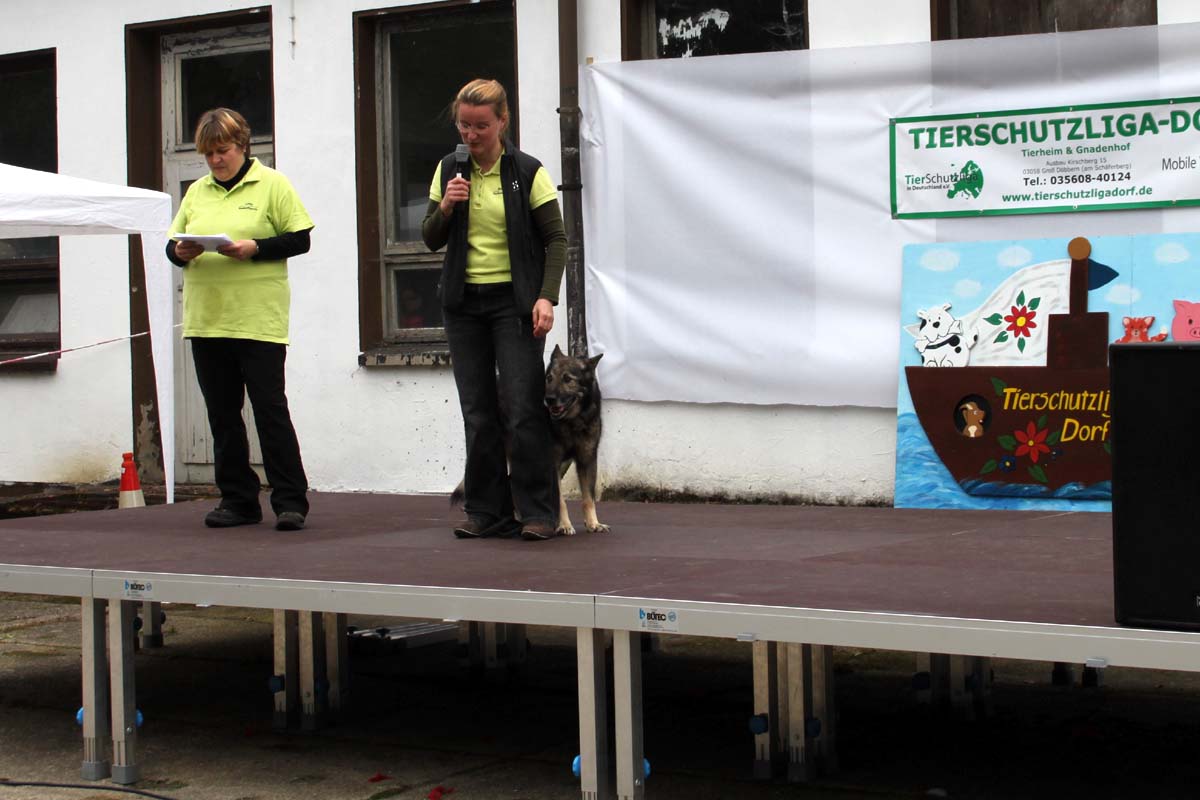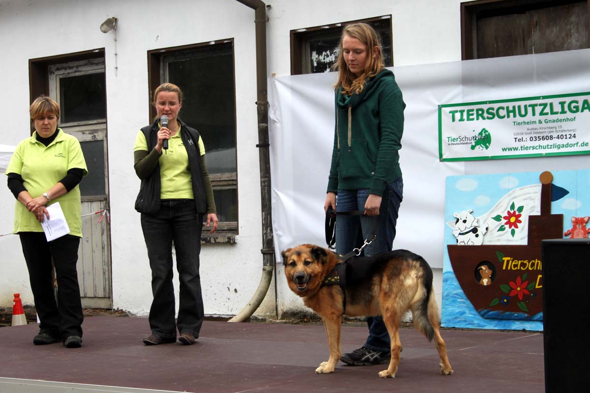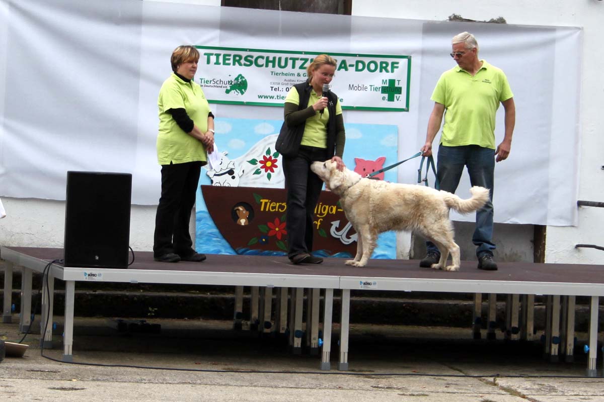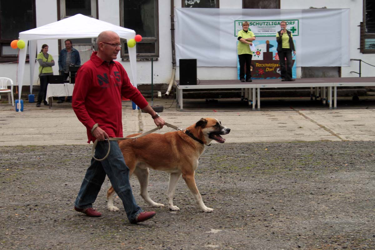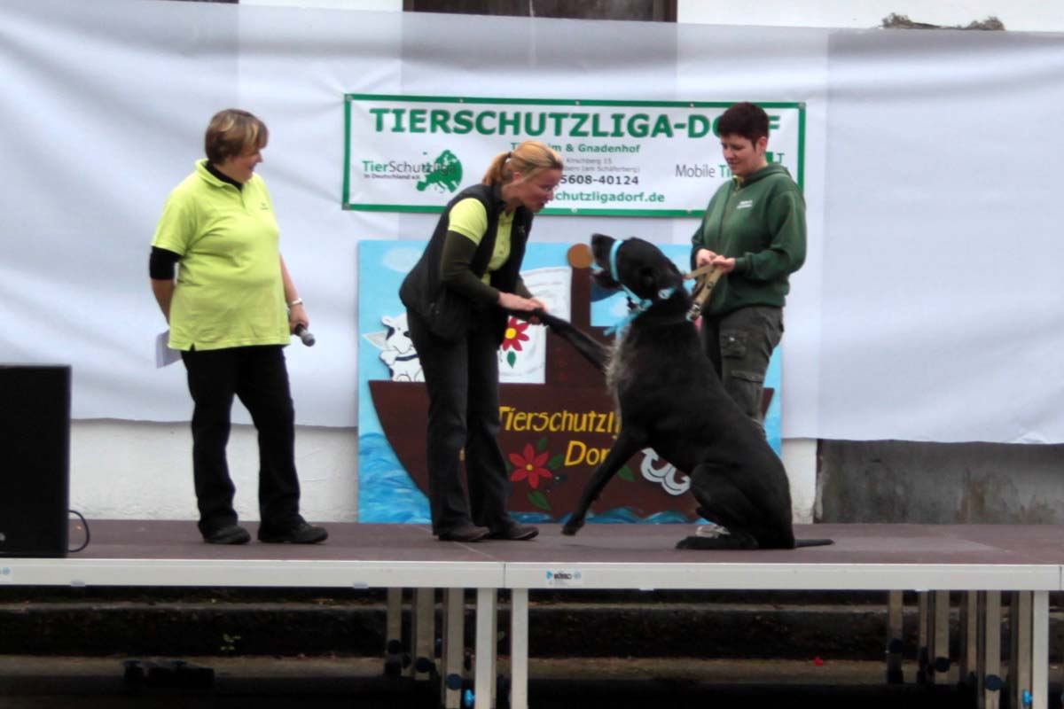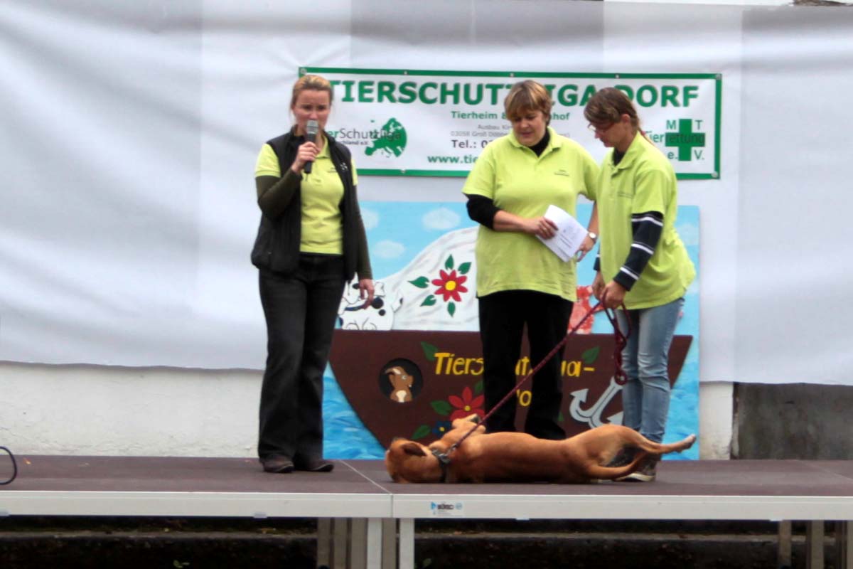 Auch unsere Hundevorführungen wurden diesmal unter verschiedene Mottos gestellt. Da kamen die „Zwerge“, die „Gemütlichen“, die „Eisbären“ und die „Riesen“ auf die Bühne. Und auch unser Gigant unter den Tierheimhunden, „Chacco“, durfte beim Programm nicht fehlen und sorgte im Publikum für staunende Gesichter, als Tierpflegerin Sabine ihn mit Pferdehalfter gesichert durch die Menge führte. Jedoch nicht nur Chacco wurde bewundert, einige unserer Hunde durften erste Kontakte mit ihren vielleicht zukünftigen Herrchen und Frauchen knüpfen. Als ganz besonderes Sorgenfellchen wurde Jaimy auf der Bühne vorgestellt. Bei dem armen Kerl wurde erst vor wenigen Tagen eine Kehlkopflähmung festgestellt. Er muss für viel Geld in einer Spezialklinik operiert werden, damit er noch ein langes Leben hat. Dank unserer lieben Besucher und ihren vielen Spenden an diesem Tag, können wir nun Jaimy in Kürze operieren lassen.