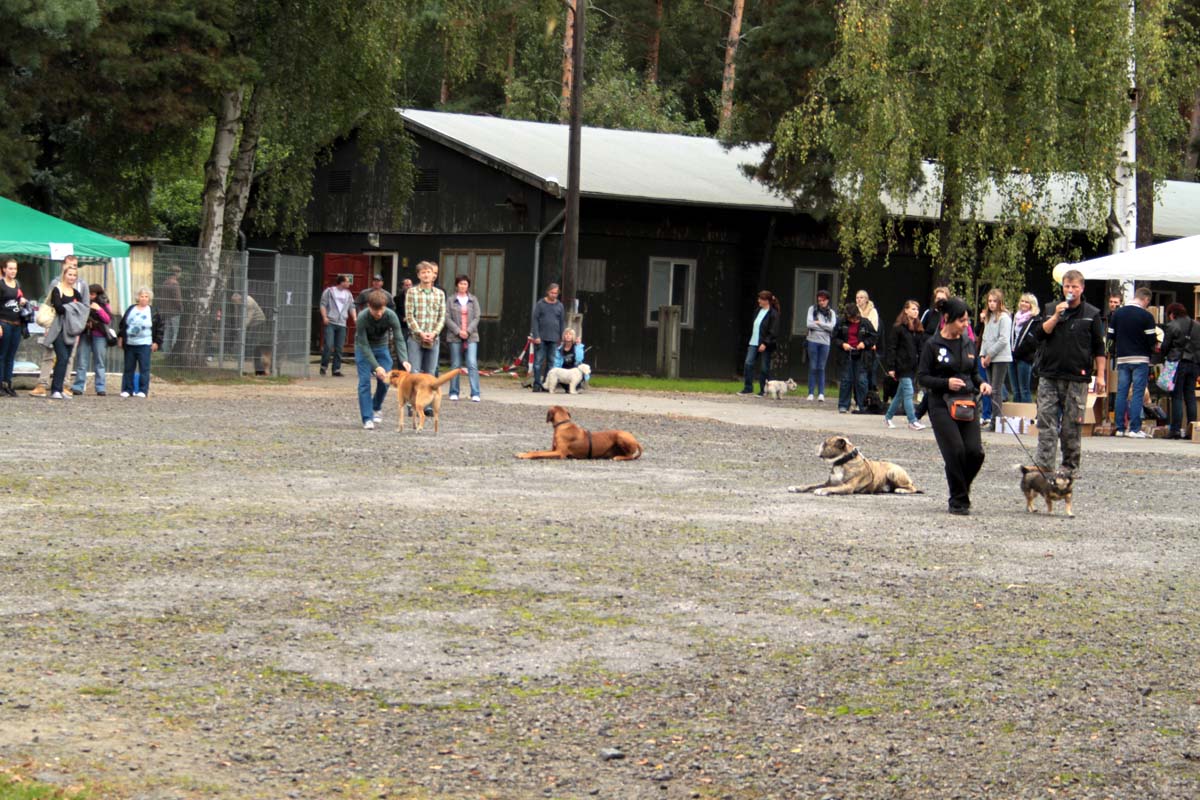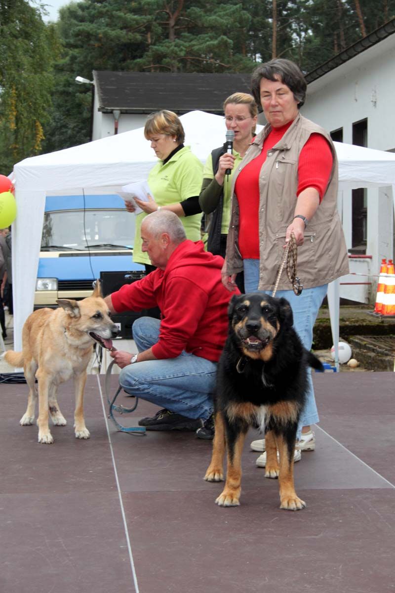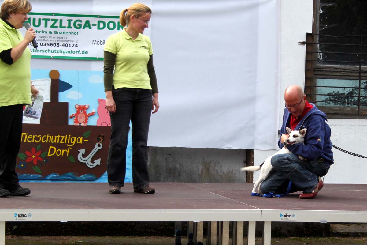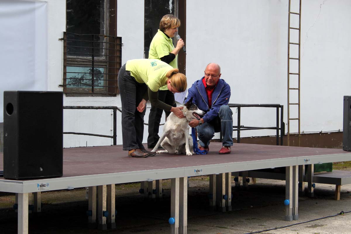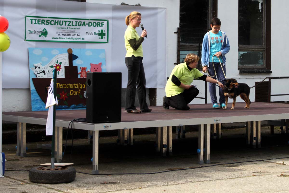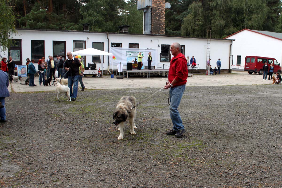 Auch unsere Hundevorführungen wurden diesmal unter verschiedene Mottos gestellt. Da kamen die „Zwerge“, die „Gemütlichen“, die „Eisbären“ und die „Riesen“ auf die Bühne. Und auch unser Gigant unter den Tierheimhunden, „Chacco“, durfte beim Programm nicht fehlen und sorgte im Publikum für staunende Gesichter, als Tierpflegerin Sabine ihn mit Pferdehalfter gesichert durch die Menge führte. Jedoch nicht nur Chacco wurde bewundert, einige unserer Hunde durften erste Kontakte mit ihren vielleicht zukünftigen Herrchen und Frauchen knüpfen. Als ganz besonderes Sorgenfellchen wurde Jaimy auf der Bühne vorgestellt. Bei dem armen Kerl wurde erst vor wenigen Tagen eine Kehlkopflähmung festgestellt. Er muss für viel Geld in einer Spezialklinik operiert werden, damit er noch ein langes Leben hat. Dank unserer lieben Besucher und ihren vielen Spenden an diesem Tag, können wir nun Jaimy in Kürze operieren lassen.