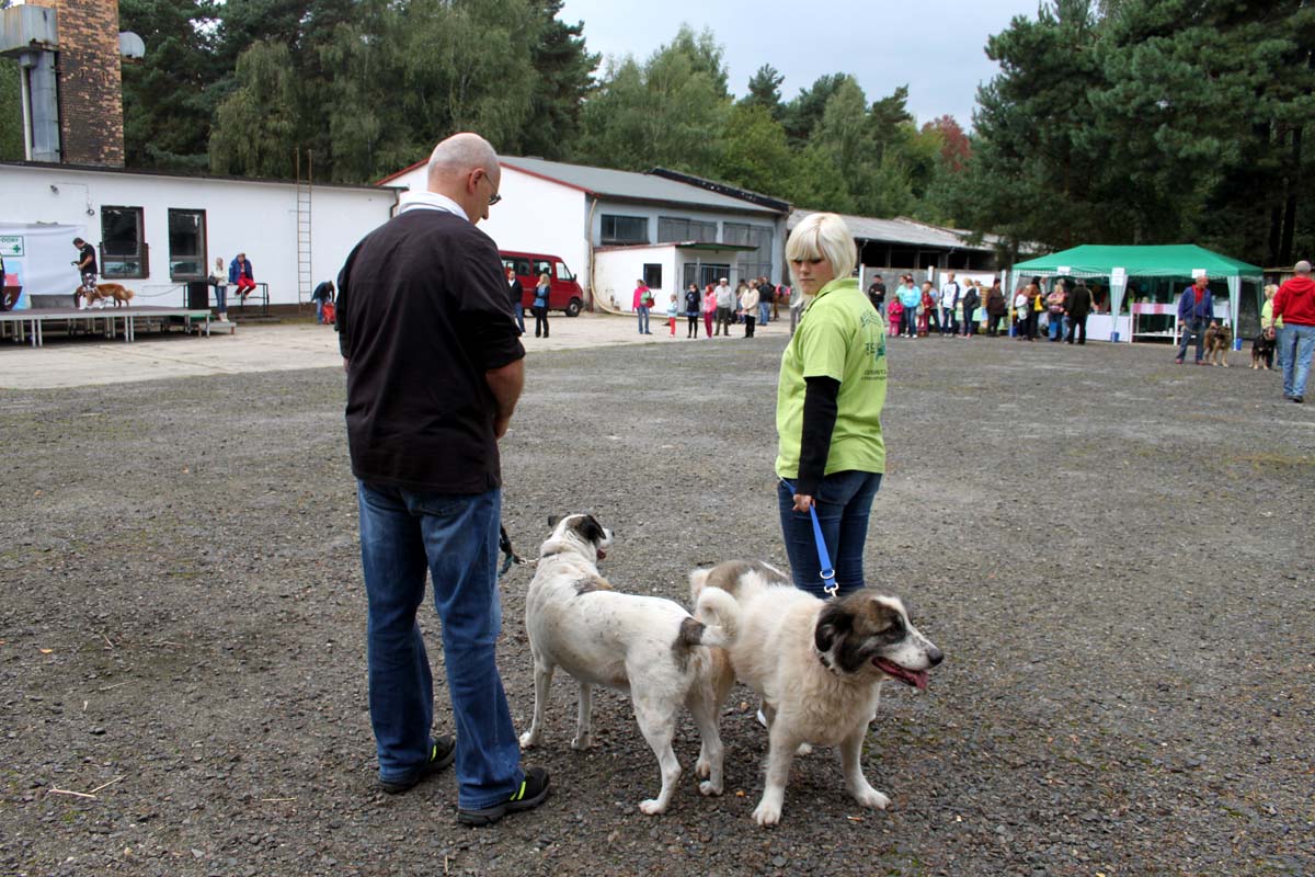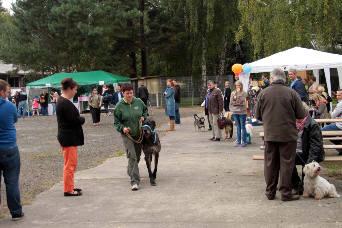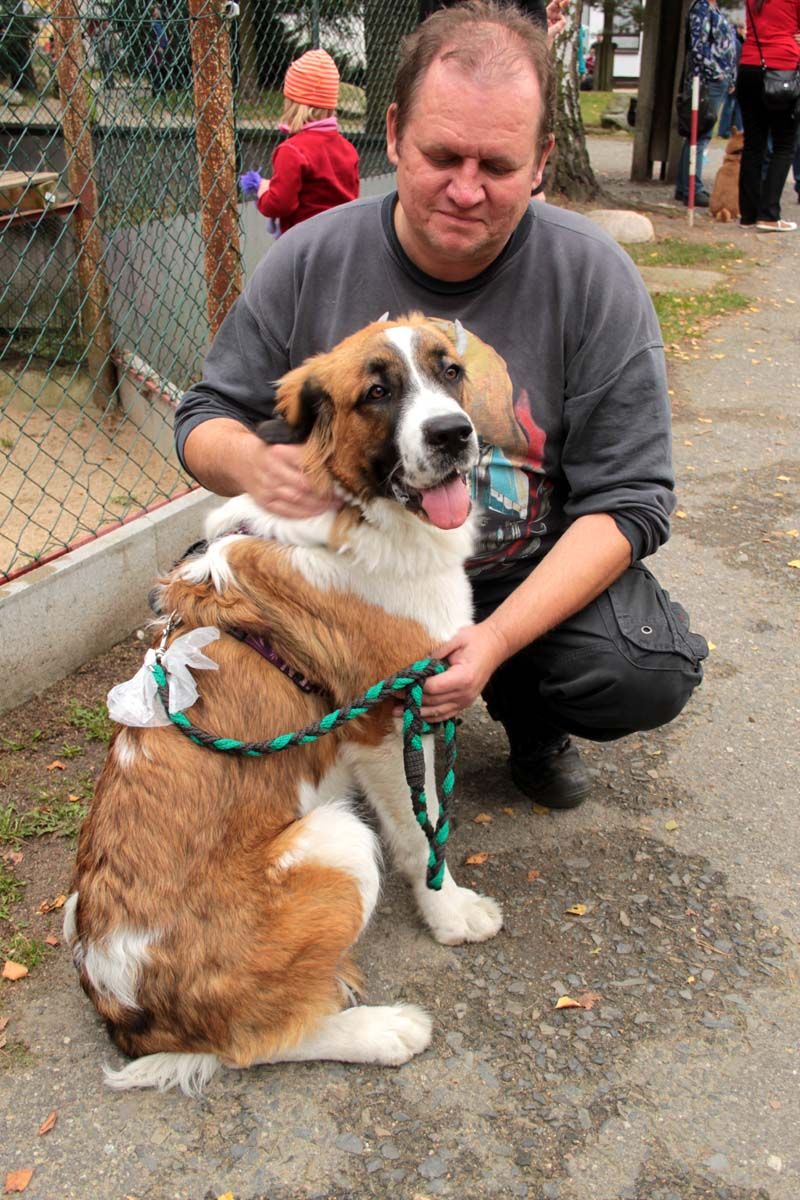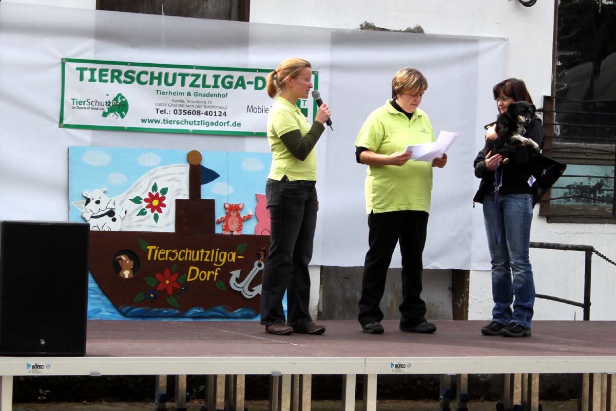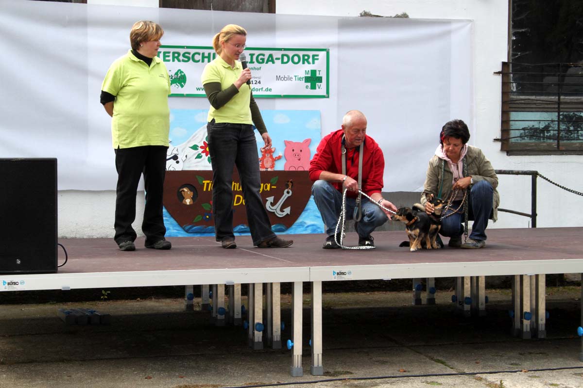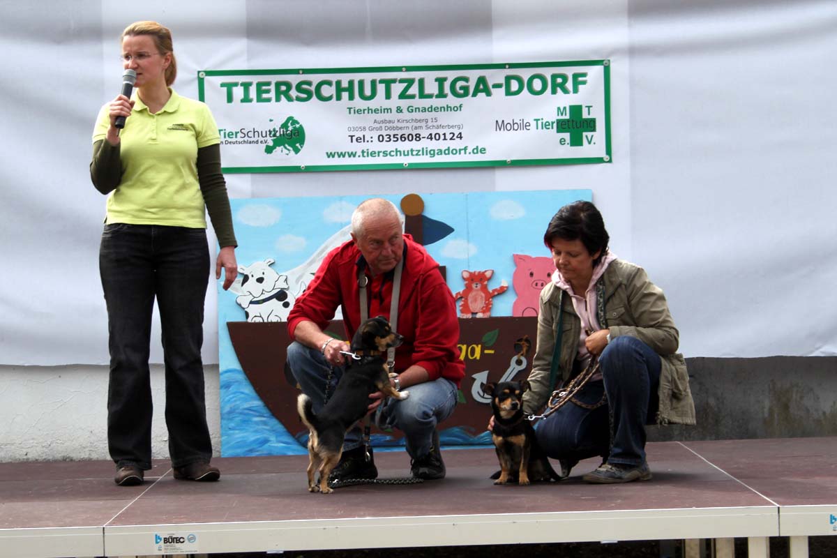 Auch unsere Hundevorführungen wurden diesmal unter verschiedene Mottos gestellt. Da kamen die „Zwerge“, die „Gemütlichen“, die „Eisbären“ und die „Riesen“ auf die Bühne. Und auch unser Gigant unter den Tierheimhunden, „Chacco“, durfte beim Programm nicht fehlen und sorgte im Publikum für staunende Gesichter, als Tierpflegerin Sabine ihn mit Pferdehalfter gesichert durch die Menge führte. Jedoch nicht nur Chacco wurde bewundert, einige unserer Hunde durften erste Kontakte mit ihren vielleicht zukünftigen Herrchen und Frauchen knüpfen. Als ganz besonderes Sorgenfellchen wurde Jaimy auf der Bühne vorgestellt. Bei dem armen Kerl wurde erst vor wenigen Tagen eine Kehlkopflähmung festgestellt. Er muss für viel Geld in einer Spezialklinik operiert werden, damit er noch ein langes Leben hat. Dank unserer lieben Besucher und ihren vielen Spenden an diesem Tag, können wir nun Jaimy in Kürze operieren lassen.