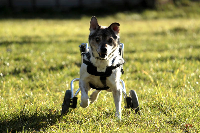 Leider wurde festgestellt, dass Mischu aufgrund einer Wirbelsäulenverletzung gelähmt ist und nie wieder wird laufen können. Wir mussten entscheiden, ob für Mischu ein Weiterleben lebenswert ist. Mischu nahm uns diese Entscheidung ab, denn jeden Tag, den er länger bei uns war, zeigte uns der kleine Opi – er will leben. Er nahm am Tierheimleben teil, wurde von Tag zu Tag mobiler, fing an Muskulatur vor allem in den Vorderbeinen aufzubauen und nach kurzer Zeit lief er bereits fröhlich in seinem Rollwagen, den wir glücklicherweise noch aus Spenden hier hatten.