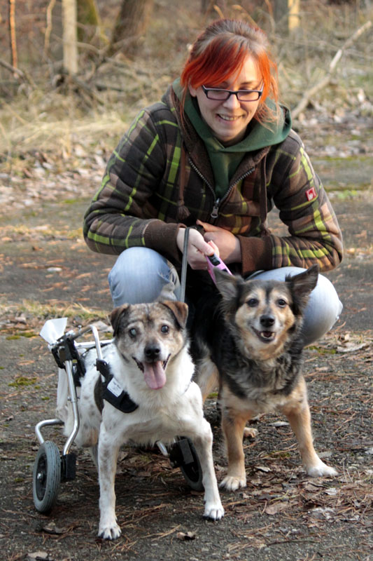 Die Pflege des kleinen Mischu ist natürlich aufwendiger als bei einem gesunden Hund. Er muss Windeln tragen, da er sein Pipi nicht immer unter Kontrolle hat. Sein Zimmer wird mit Decken ausgelegt, damit er seine Beinchen nicht wund scheuert, wenn er durch die Gegend robbt. Aber am liebsten ist Mischu in seinem Rollwagen, dann flitzt das Männlein durch die Natur und es gibt für ihn kein Hindernis.