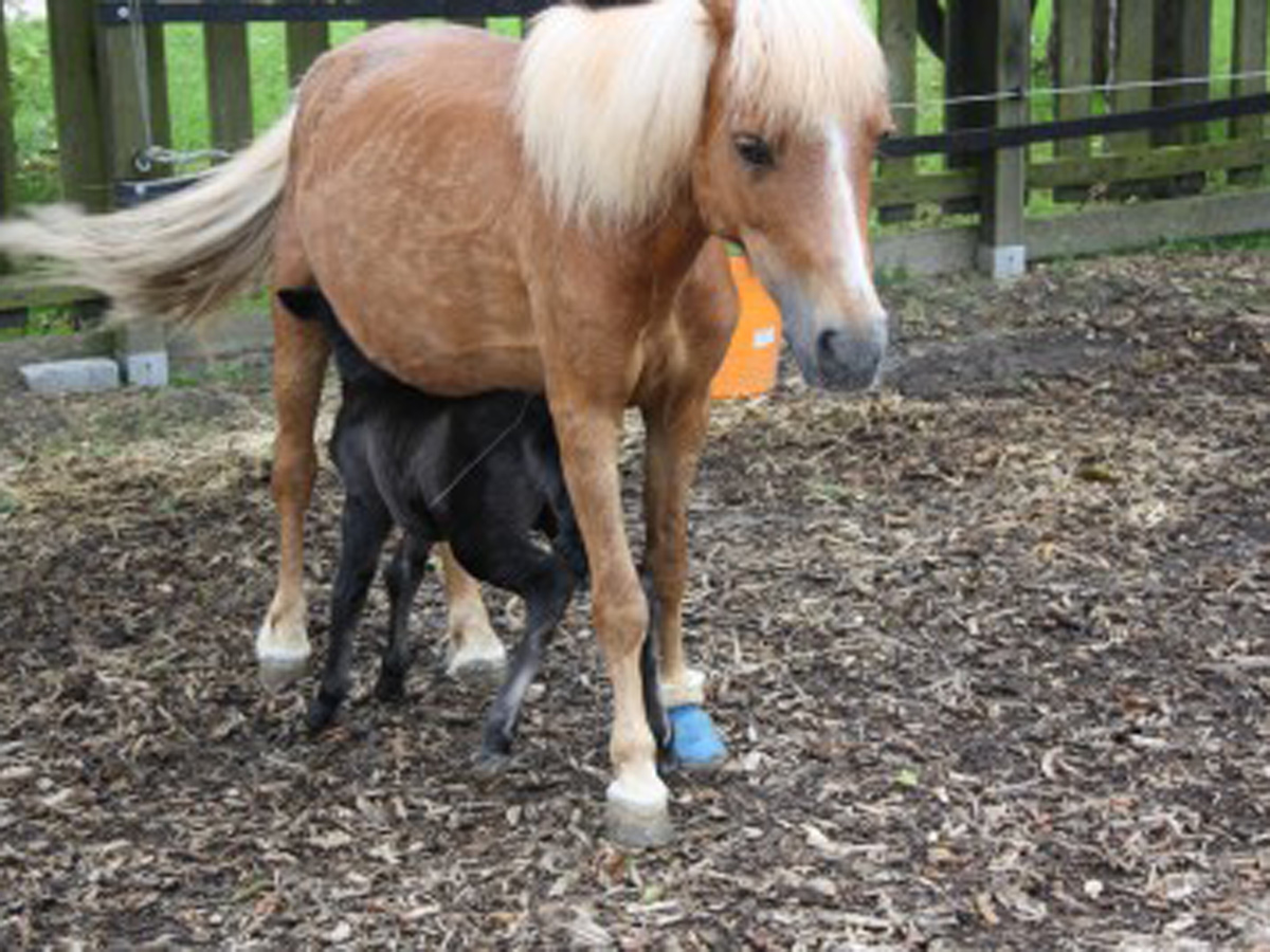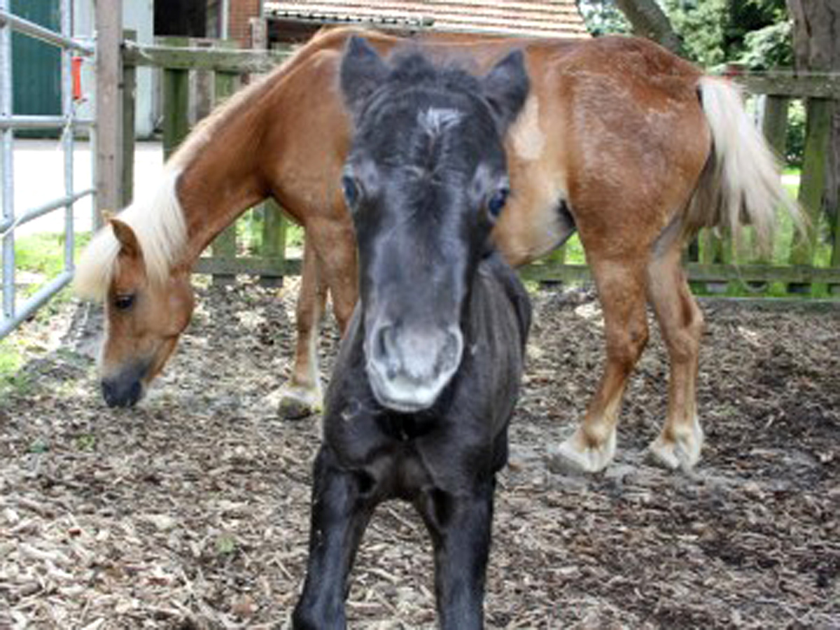 Die kleine Fuchsstute Morle kam im November 2015 in unsere Obhut. Sie litt an akuter Rehe und der Besitzer wollte Ihre Behandlungskosten nicht weiter tragen, so dass er sie auch Schlachten lassen wollte, falls sich niemand für die Stute finde. So holten wir Morle mit beiden Vorderbeine in Gips auf unseren Hof. Nach einigen Wochen konnte der Gips abgemacht werden und gegen Verbände und spätere Hufeisen ersetzt werden. Morle braucht regelmäßig (alle 8 Wochen) einen neuen Rehe beschlag. Ab dem späten Frühjahr 2016 machten wir uns erneute Sorgen um die kleine Dame, sie wurde immer dünner und legte an Bauchumfang zu. Zuerst schoben wir es darauf, dass sie nur Heu wegen der Hufrehe bekam und durch die Rehe sich nicht viel Bewegte und an Muskulatur verlor. Wir beobachteten das ihr Euter gewachsen ist, dann wurde uns klar, dass wir nicht nur ein Pony gerettet, sondern gleich ein „Doppelpack“ bekommen haben. Mittlerweile kann man die Tritte des ungeborenen Fohlens deutlich sehen. Nun war es soweit…. Am 31.07.16 hat Morle ein gesundes Hengstfohlen (Cracker) zur Welt gebracht. Der kleine muss jetzt erst mal untersucht, geimpft und entwurmt werden.
