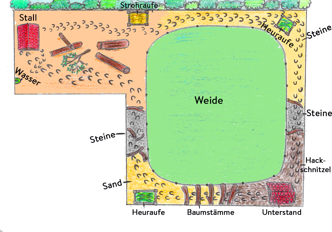 Mathes darf kein Gras fressen und deshalb steht er immer daneben. Aber auch die anderen Gnadenhofponys werden oft von Langeweile geplagt und deshalb haben wir uns etwas einfallen lassen. Wir möchten gerne unsere vordere Weide als Trail umgestalten. Außen herum möchten wir einen Naturpfad gestalten, der mit verschiedenen Untergründen, wie Steine, Sand, Naturboden, Hackschnitzel und Ästen ausgelegt wird. Das Interessante bei diesem Trainingspfad ist, dass die Ponys gezwungen sind eine weite Strecke zu laufen um an ihr Wasser und wieder zurück in ihren Stall zu kommen. Auch die verschiedenen Untergründe und Hindernisse sorgen für geistige Aufmerksamkeit. Hier gilt: „ohne Fleiß, kein Preis“. Das Tor zur Weide wird nur zeitweise geöffnet und die Ponys müssen immer wieder einmal nachschauen ob es offen ist. Was hier wie Quälerei klingt, wird zur Förderung der Bewegung durchgeführt. Die Ponys müssen mehr laufen, die Langeweile schwindet und die Gesundheit und Zufriedenheit steigt. Auch Mathes kann diesen Pfad erkunden und ist somit mit den anderen zusammen und nicht mehr alleine im Miniauslauf, nur weil er anders Futter haben muss. Der Bewegungspfad bekämpft Langeweile, ist 12 Monate im Jahr nutzbar und wird auch bei unseren Kindertagen zum Einsatz kommen. An diesen Tagen können dann die Kinder mit den Ponys laufen. Denn auch hier gilt, Bewegung fördert die Gesundheit, bekämpft Langeweile und macht einfach nur Spaß.