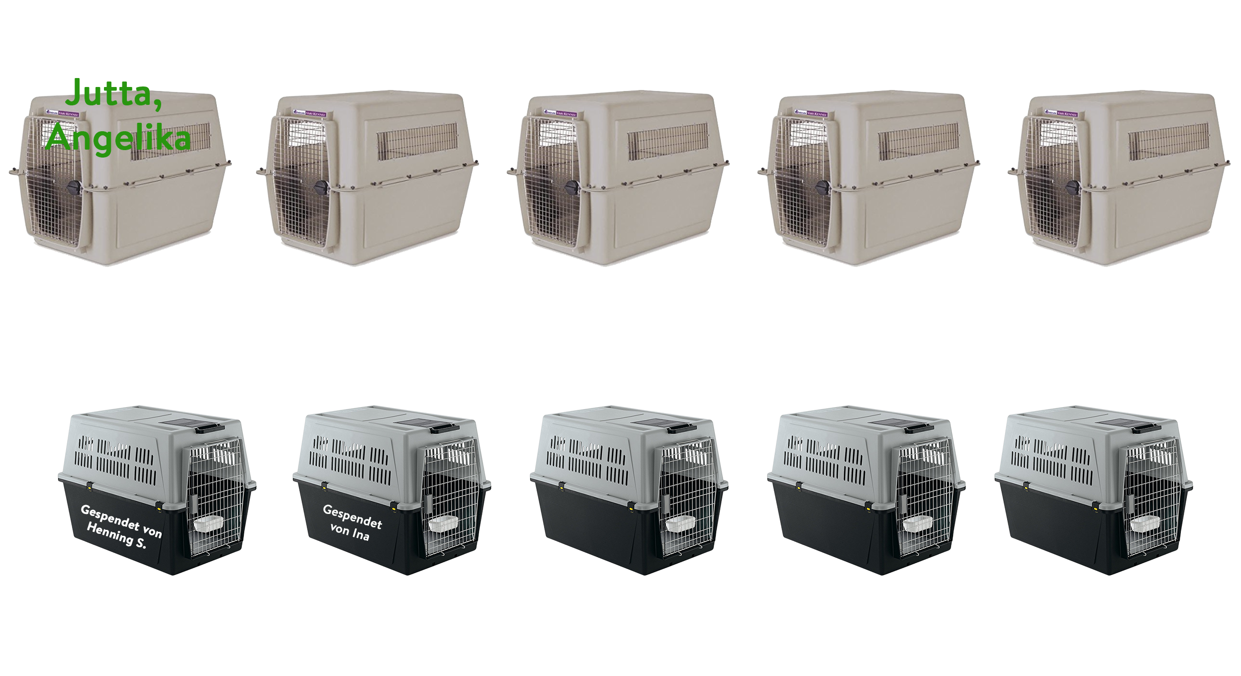 Diese Transportboxen sind nicht billig, halten aber jahrelangem Tierheimeinsatz stand. Insgesamt benötigen wir 2154,50 Euro für 5 kleine und 5 große Boxen. Das ist im Tierschutz eine Menge Geld und deshalb bitte wir Sie um Unterstützung. Die große Box kostet 279 Euro und die kleine 151,90 Euro. Sie kaufen eine Box, oder eine halbe oder ein Drittel und wir schreiben Ihren Namen auf die Transportbox. So wird Ihre Unterstützung in den nächsten Jahren weithin sichtbar sein.