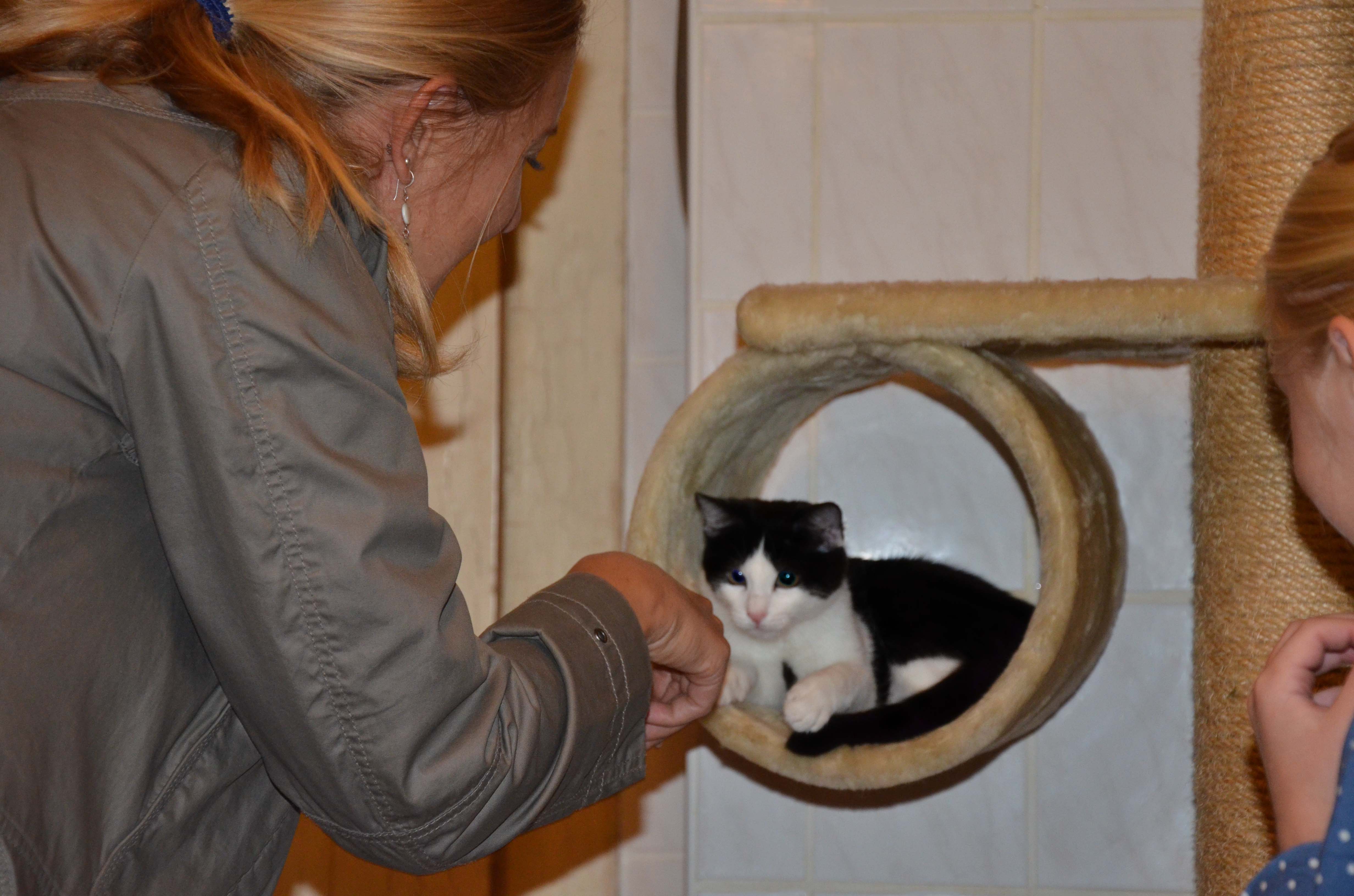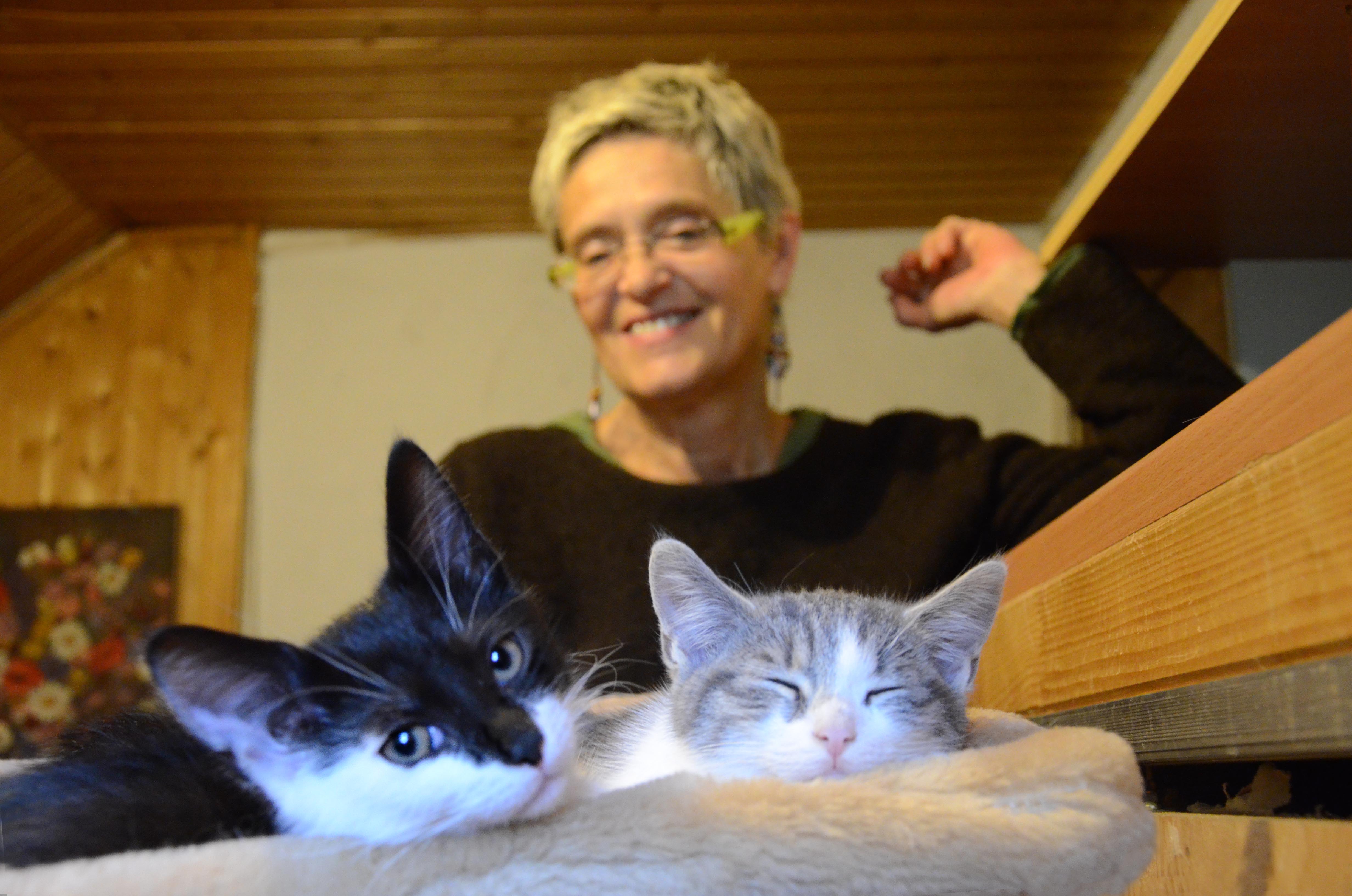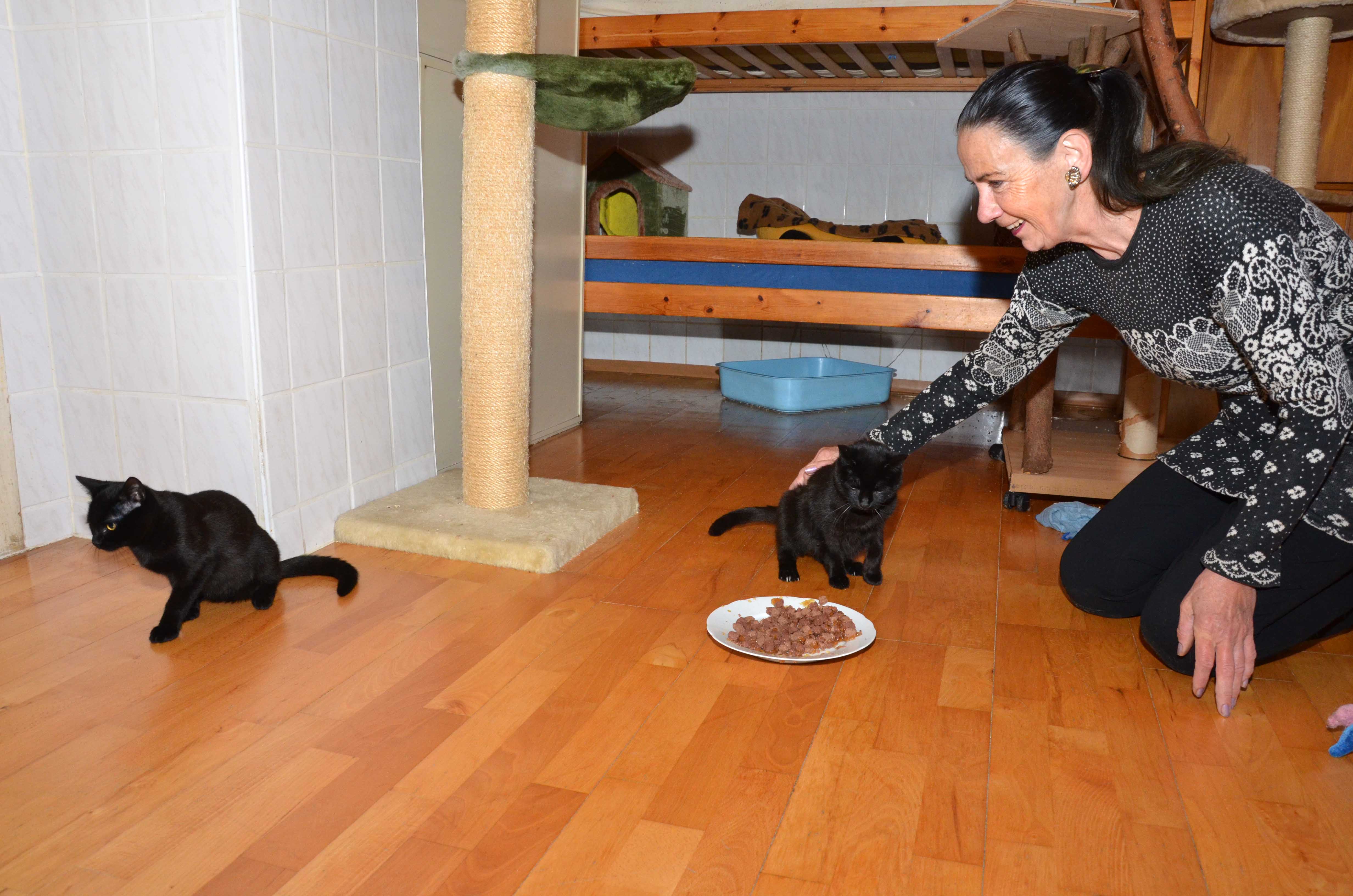 Meist holt Leiterin Helga Grüning die Katzen selbst aus den angeschlossenen Tierheimen oder die Mitarbeiter von dort bringen die Katzen nach München. Typische Bewohner unserer Katzenstation sind z.B. Sunny und Sierra, zwei Schwestern im Alter von 14 Monaten. Die beiden kamen als ganz kleine Katzenbabys in einen unserer Partnervereine. Sie waren einerseits sehr scheu und anderseits schwarz – beides für sich alleine schon schlechte Voraussetzung für eine Vermittlung. Menschen wünschen sich Katzenwelpen, und die Farbe schwarz kommt eher schlecht an. Sunny und Sierra sind sehr sanfte Mädels, denen wir mit Ruhe und Geduld Vertrauen zu Menschen lernen. Denn wenn sie ihre Scheu verlieren, finden wir einen guten Platz für sie.