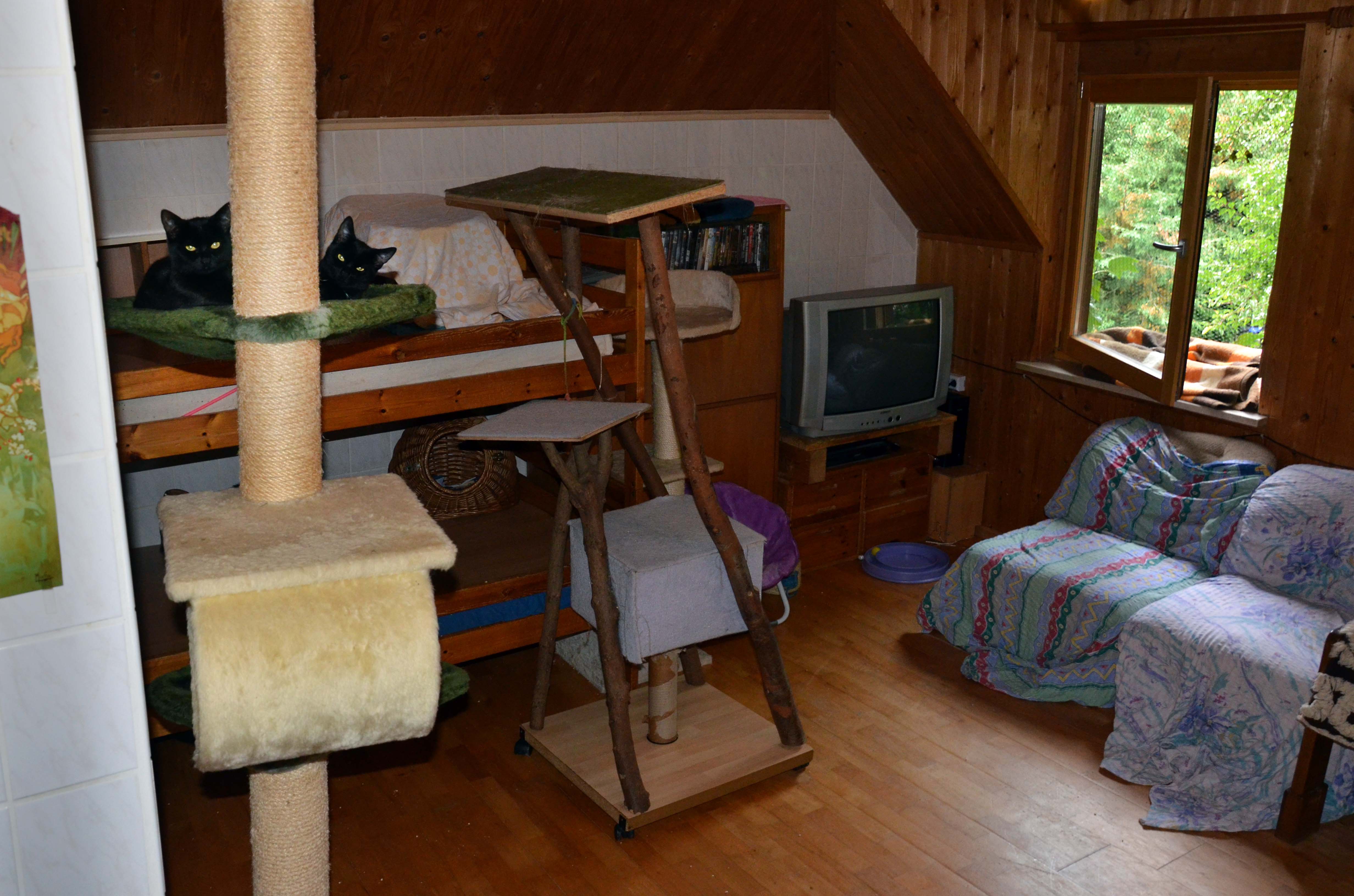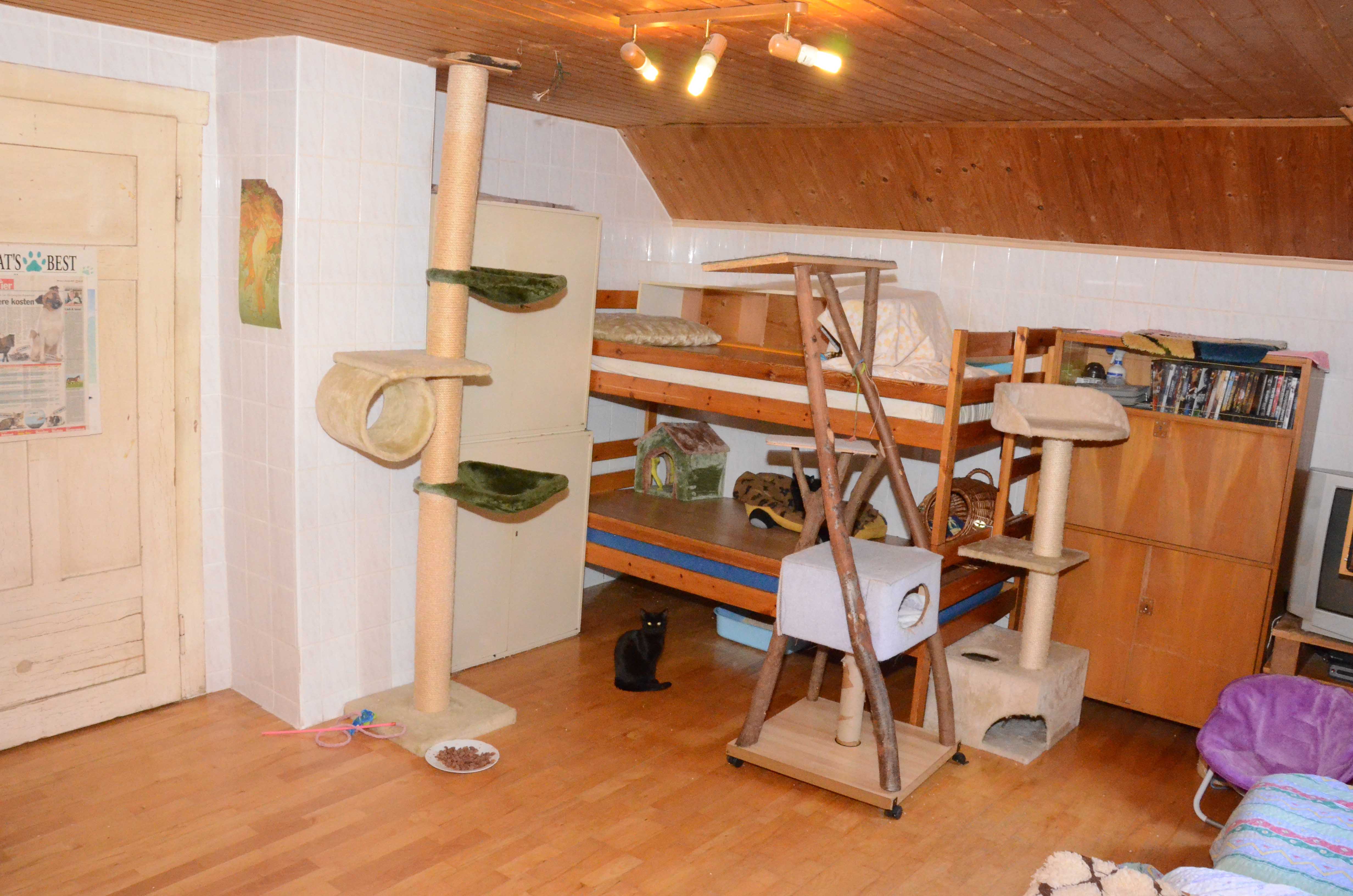 Die Vermittlungskatzen wohnen in drei schönen Zimmern, eingerichtet mit Kletterbäumen, Sofas, Decken, Rückzugsmöglichkeiten und erhöhten Plätzen.